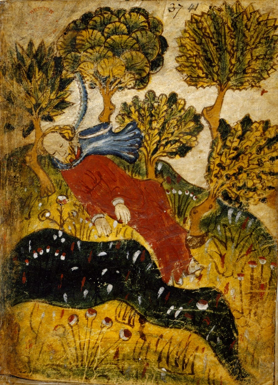 nb: in which the speaker’s soul leaves his body, and visits paradise in a dream. paradise takes the form of a forest. this part of the poem is essentially an enraptured praise chorus, which is so not my wheelhouse/ comfort zone, and which cost me some labour (still not happy with it). my most significant change/ distortion has been to try and make the forest feel more real, more particular, and to link it back/ cite it within my speaker’s culture and historical situation. more about that anon. oh, and please excuse the formatting, which won’t be quite right owing to the vagaries of the stack.